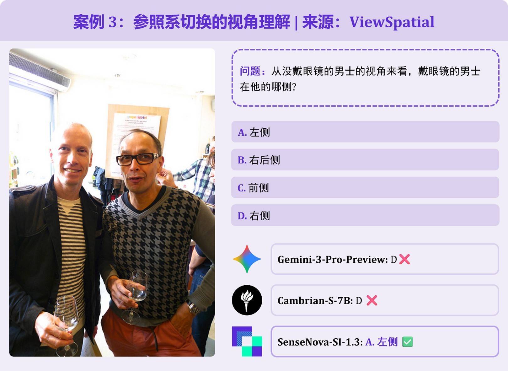 题目条款以 “未戴眼镜男士的本身视角” 判断身旁戴眼镜男士的场地,查考 “参照系调养” 身手,模子很容易以“不雅察者视角”来判断主张。Gemini-3-Pro就误选了 “右边”;SenseNova-SI-1.3则能正确给出 “左边” 的正确谜底。