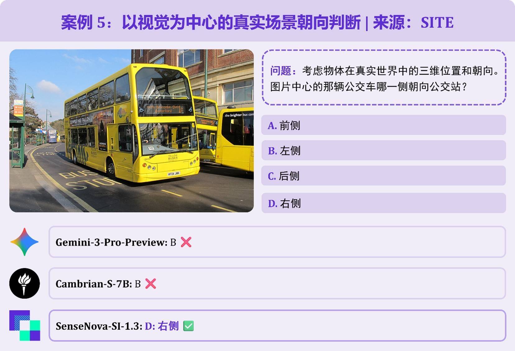 以双层巴士与公交站的场景为题,需幸免堕入“英国巴士靠左行驶,因此靠站的是左侧”的学问罗网,而是通过骨子的视觉画面判断场地。Gemini-3-Pro误判 “左侧” 为谜底;而 SenseNova-SI-1.3 则准说明识 “右侧” 为正确谜底。