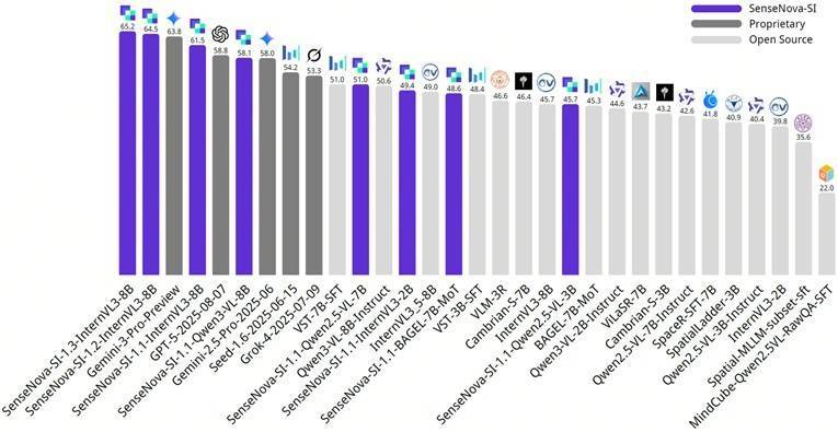 商汤科技认真开源空间智能模子日日新SenseNova-SI-1.3,在空间测量、视角调养、概括推理等中枢任务中展现出显赫擢升,另外对比之前的版块增强了陈说简答题的身手。在集成多项巨擘空间智能榜单的概括评测平台EASI上,SenseNova-SI-1.3概括性能突出Gemini-3-Pro,中分斩获EASI-8(八个巨擘空间智能榜单的夹杂评测)法度第一,在多个高难度空间任务(尤其是视角调养)中发扬优异。
