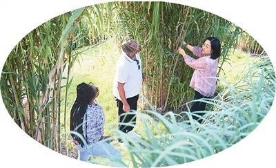 林占熺长女林冬梅(右)为留学生先容菌草的助长情况。 新华社记者 林善传摄