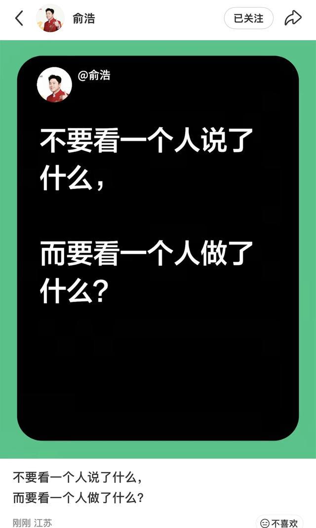 俞浩暗示,“不要看一个东谈主说了什么,而要看一个东谈主作念了什么?。”