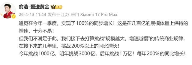 4月14日,追觅创举东谈主俞浩在酬酢荟萃平台发文,疑似复兴外界质疑。